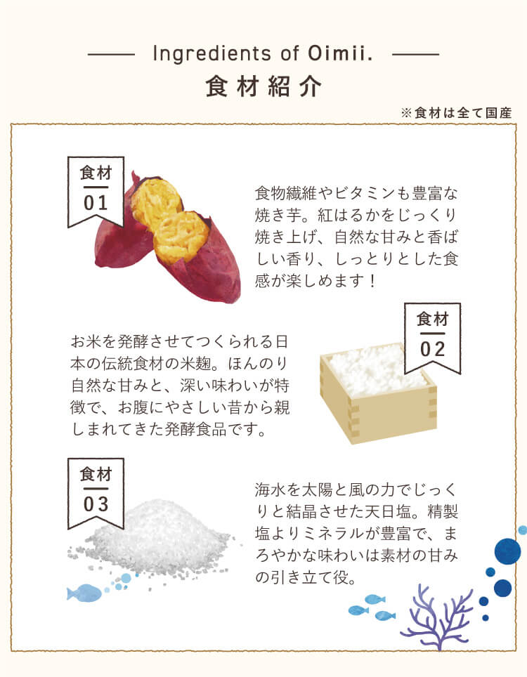 2、カラダに優しい:紅はるか、米麹、天日塩。カラダ想いの国産原料。